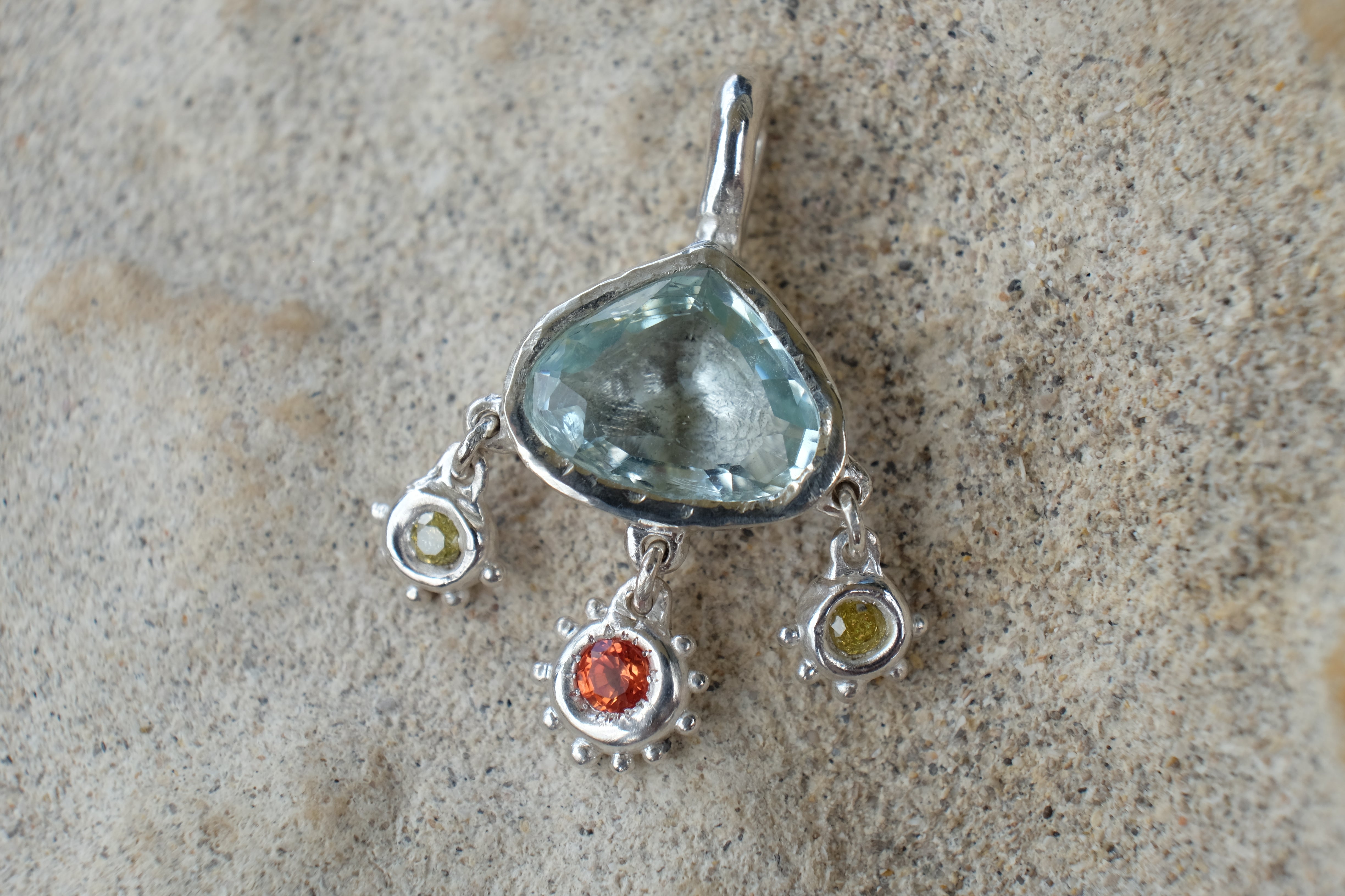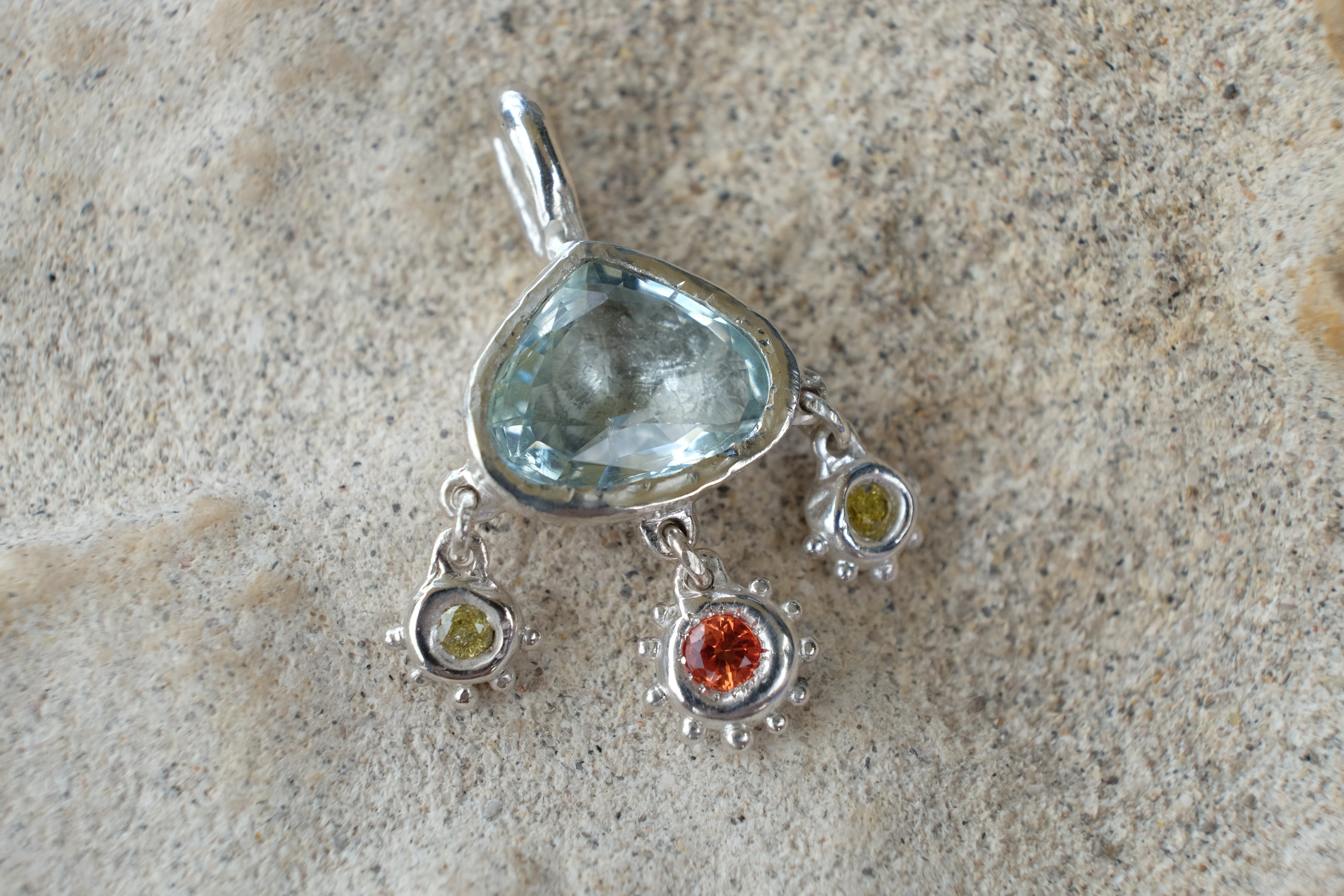 featuring an absolute cracker of an aquamarine (such a wicked cut) from queensland, two yellow and one orange lab sapphire, this sweet little dotted darling has such fun movement and colour
